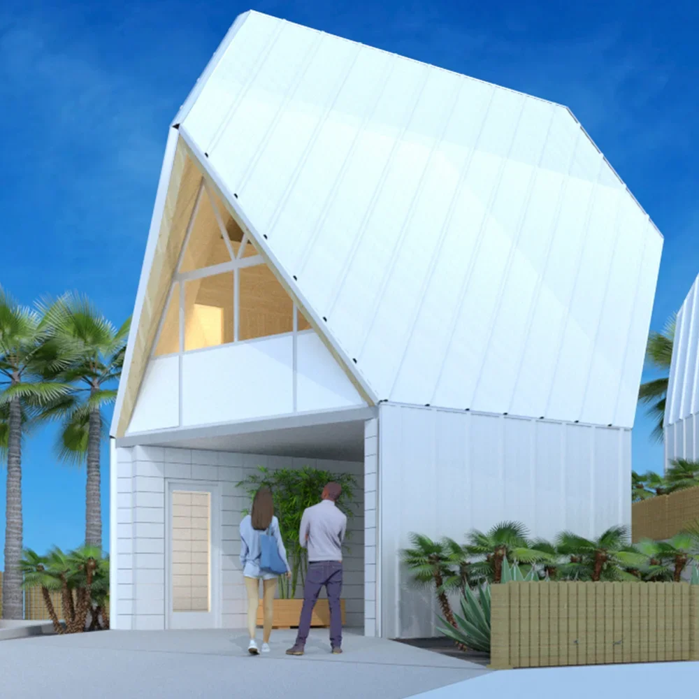 At the scale of a detached town-home, the Tetra-Two includes the following spaces: x2 Bedroom, x2 Baths, a Sleeping Loft, and a Garage Port, distributed across a 440 SF Ground Floor, a 440 SF First Floor, and a 100 SF Sleeping Loft.